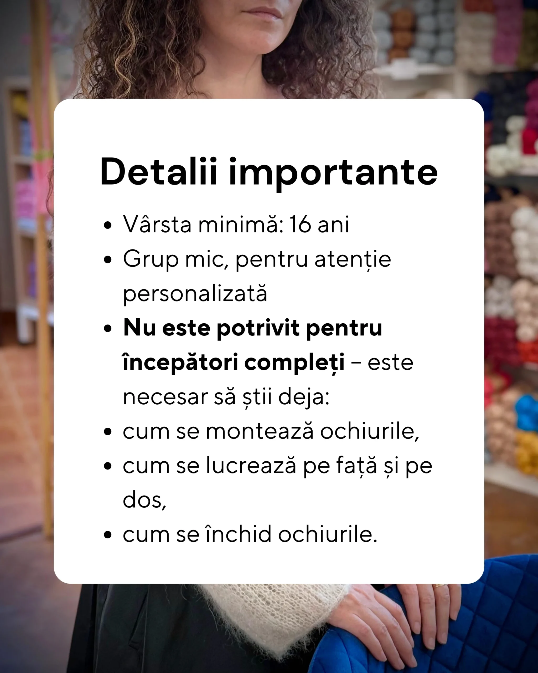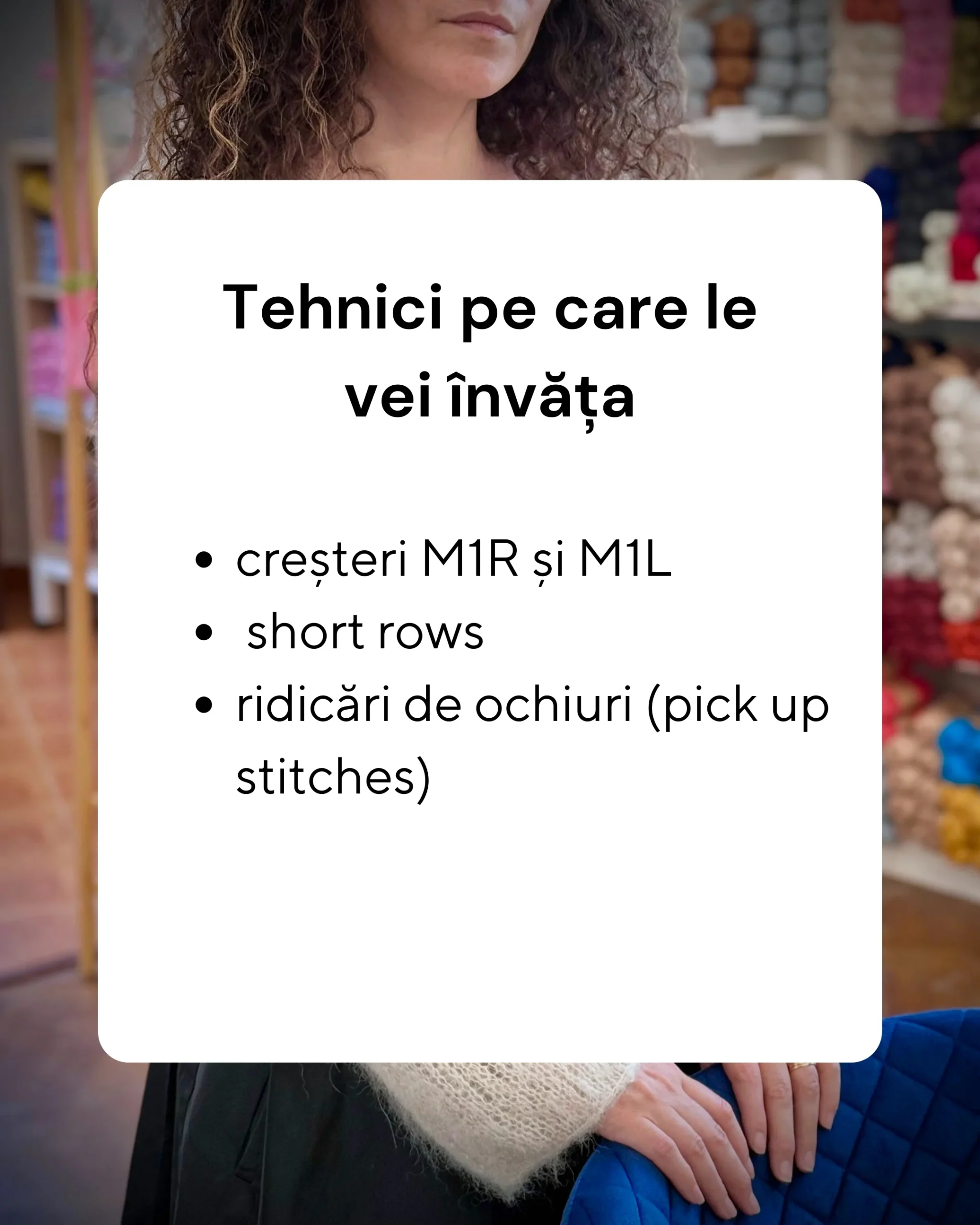 Un atelier clar, prietenos și aplicat, perfect dacă vrei să treci la următorul nivel în tricotat.